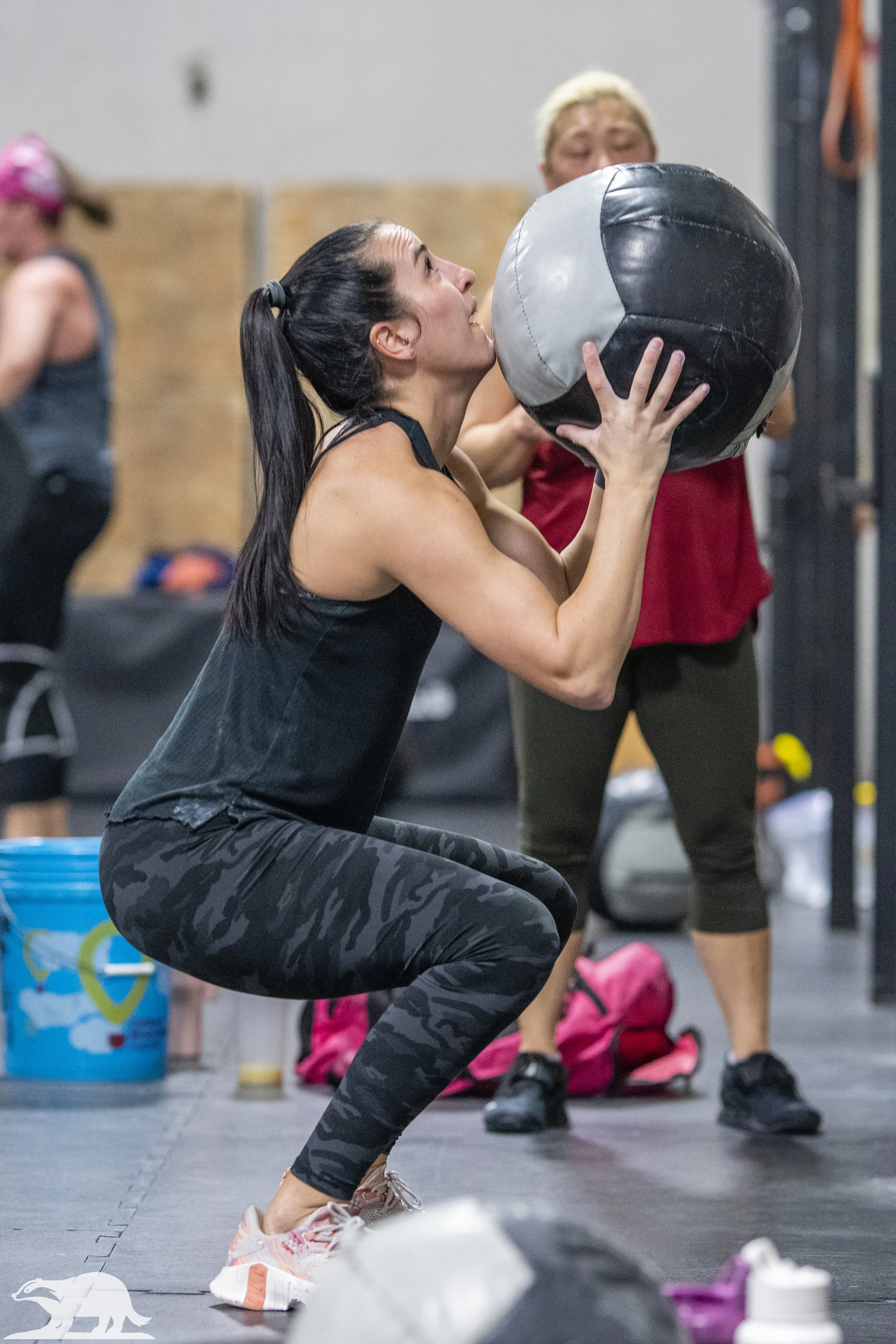 Wall Balls: Elbows should stay in front of the body and hip crease needs to pass below parallel. Focus on a good dynamic drive with tension out of the hole as we release the ball.