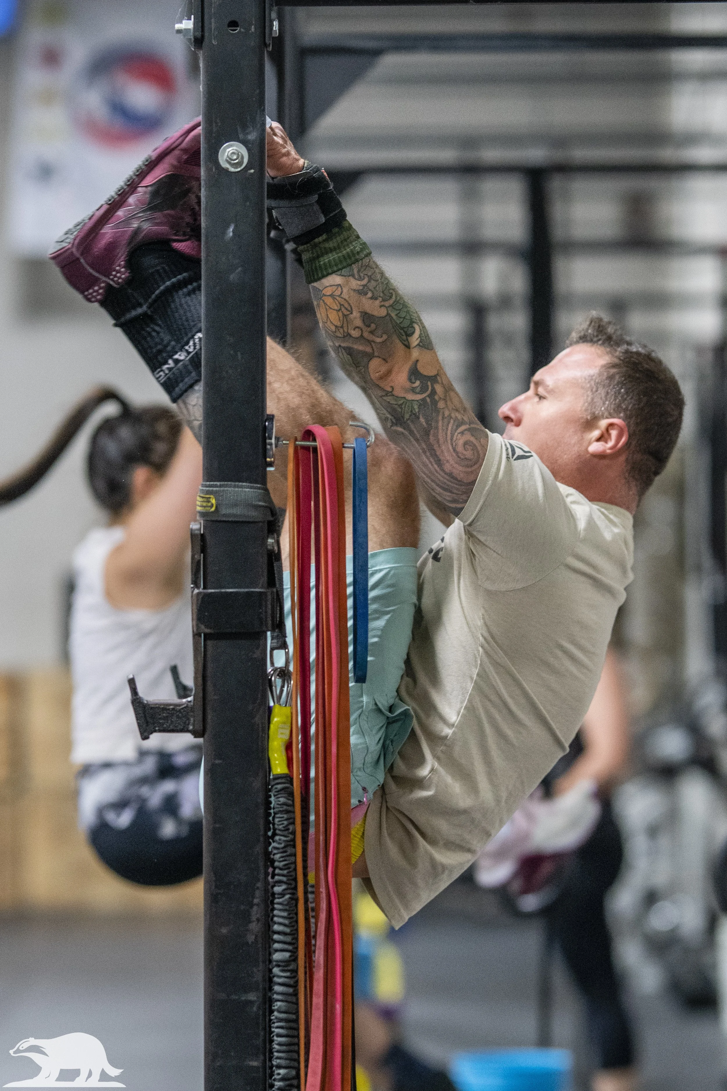 Toes-to-bars: We are focused on maintaining an active shoulder position as we move through the hollow position to the arched position. Focus to press away from the bar to create space that will allow for compression of the midline and the toes to come to the bar. We should look to keep the dynamic positions today when scaling, so moving to an alternating toes-to-bars or kipping knees-to-elbows/knees-to-chest would be ideal in order to maintain fluid dynamics. The next scale would be to move to a strict knee raise or knees-to-elbow, specifically for those with shoulder or back issues.