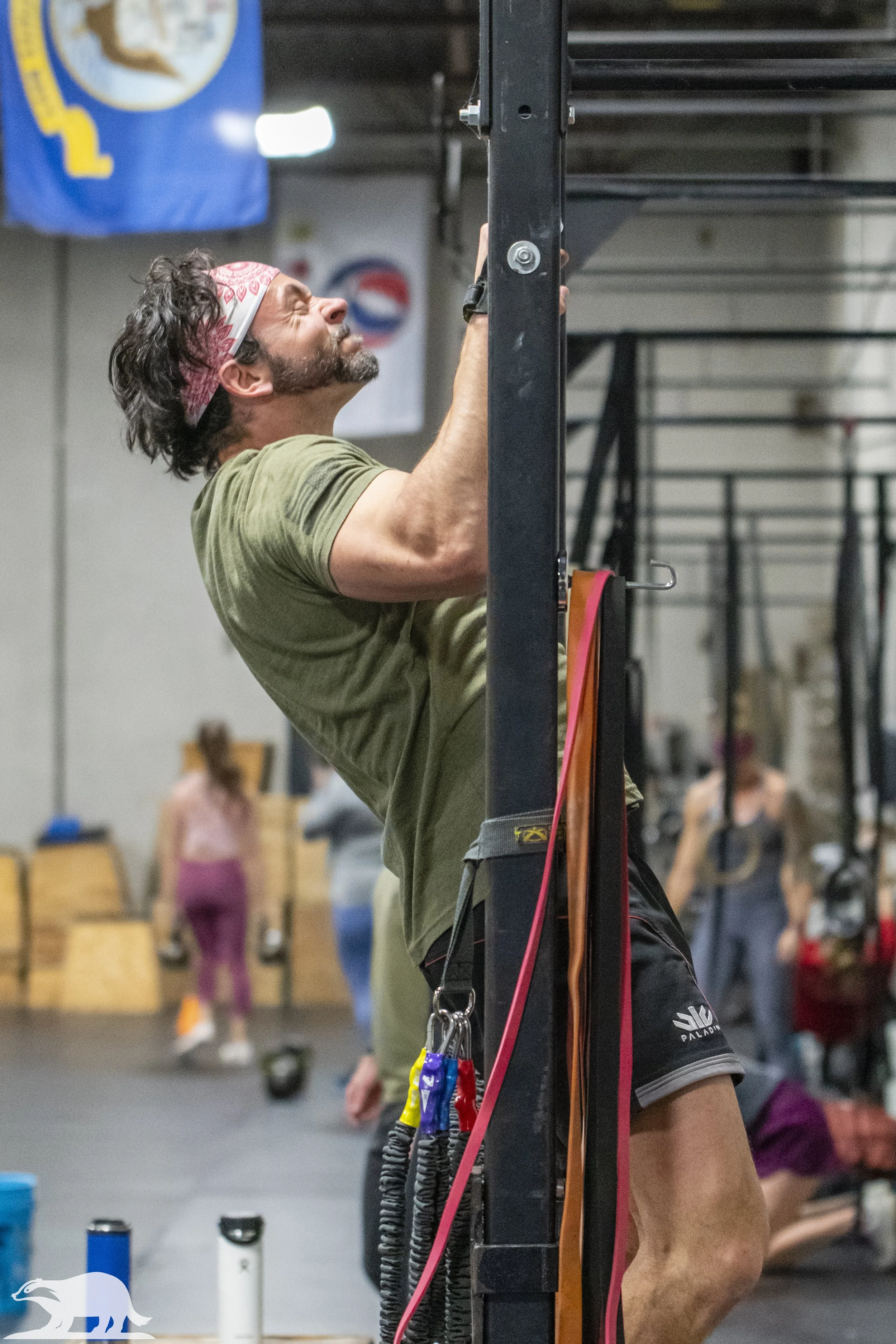 Med Ball Weighted Strict Pull-ups: Hold the medicine ball pinched between your legs at the ankles. Keep the belly tight and move in a hollow position. Focus to activate through the lats, pulling forcefully and vertically. If we need to scale we can lower the weight, go to a traditional strict pull-up, or move to a strict banded pull-up.