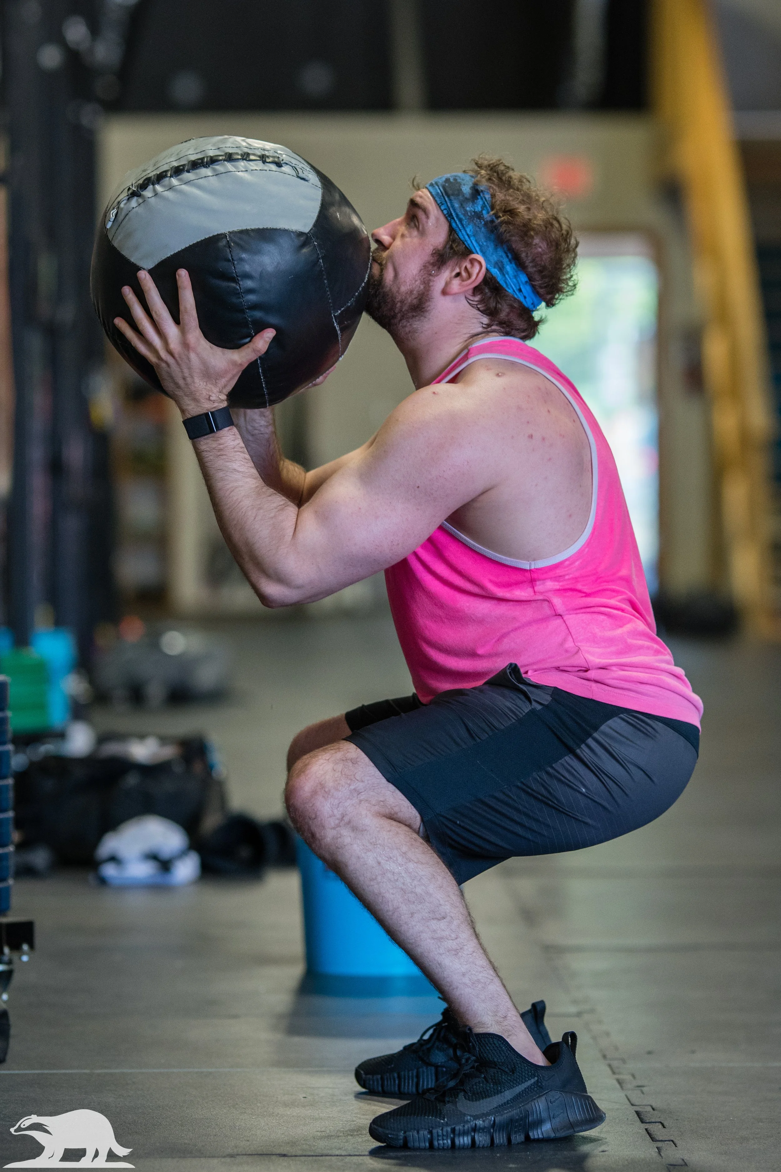 Wall Balls: Elbows should stay in front of the body and hip crease needs to pass below parallel. Focus on a good dynamic drive with tension out of the hole as we release the ball.