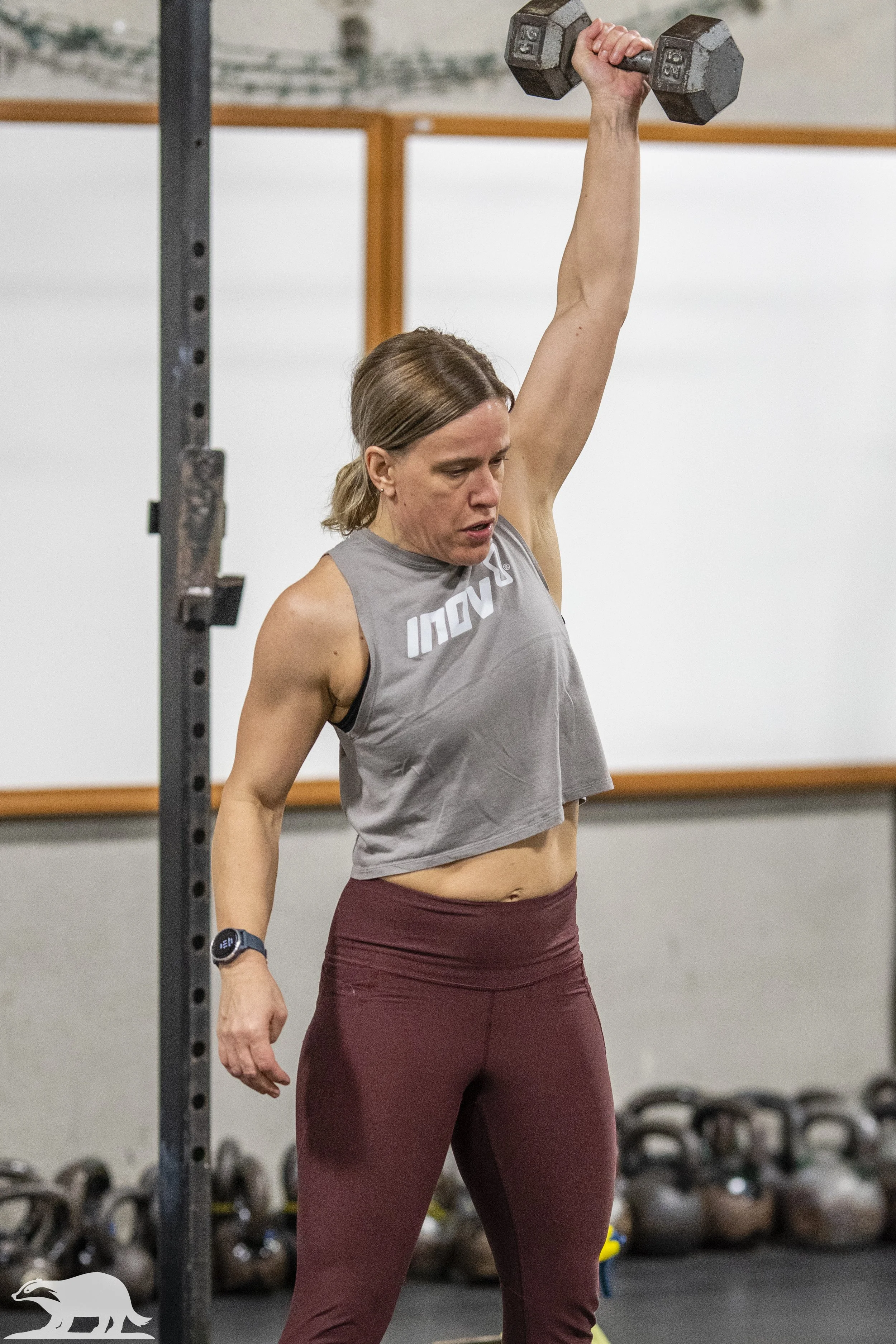 Single Arm Dumbbell Hang Snatches: Keep the torso upright and dumbbell Close. Pull fast with a high elbow position, then move into a quick punch overhead with a firm lockout.