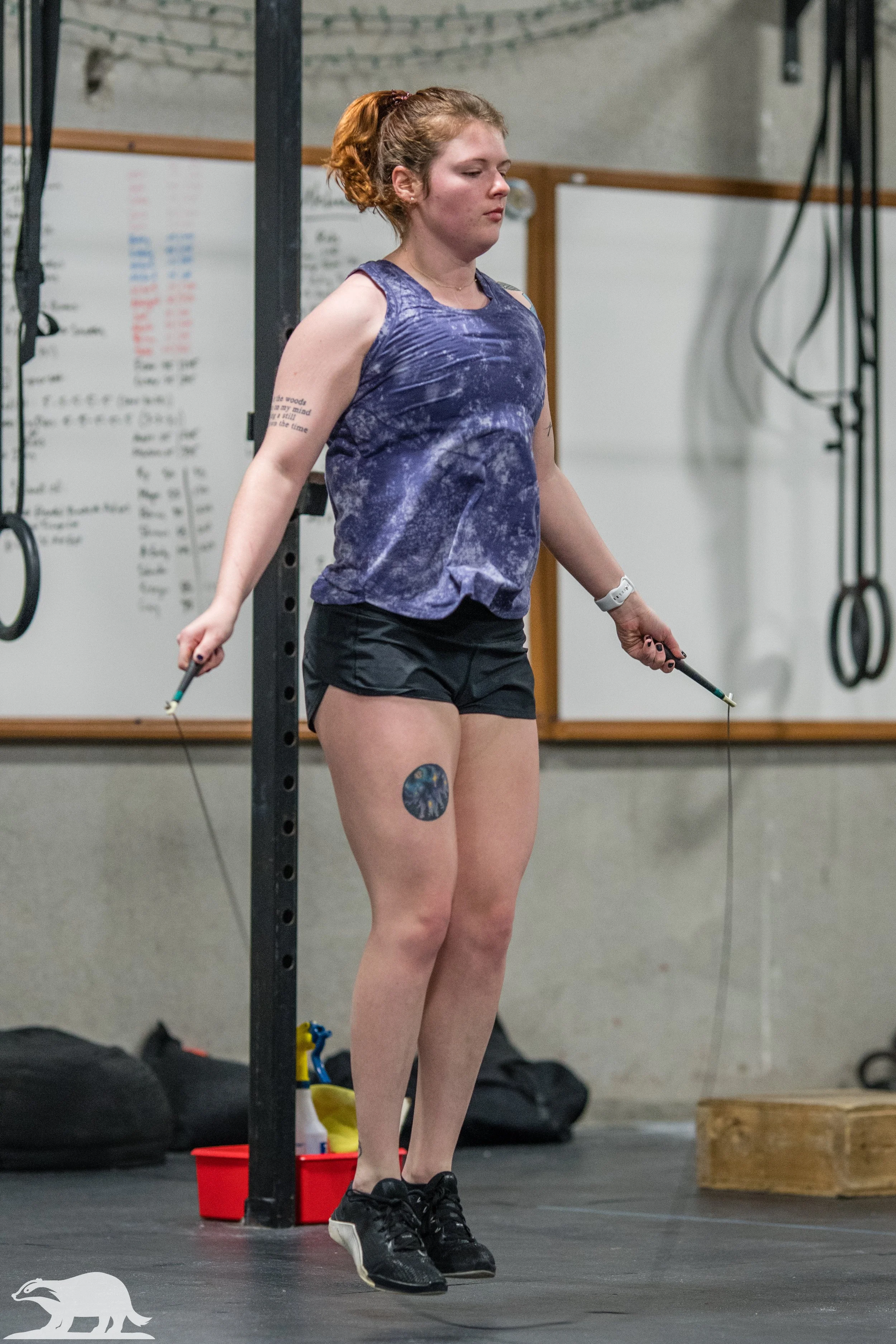 Double Unders: Eyes should look 4 feet out in front and down to create a focal point. Keep hands right by the pockets and focus on jumping higher to create more space for the double under. Then think “hit hit”. As we progress here, shortening the jump and increase the speed on the jump rope will decrease total working time on each set.