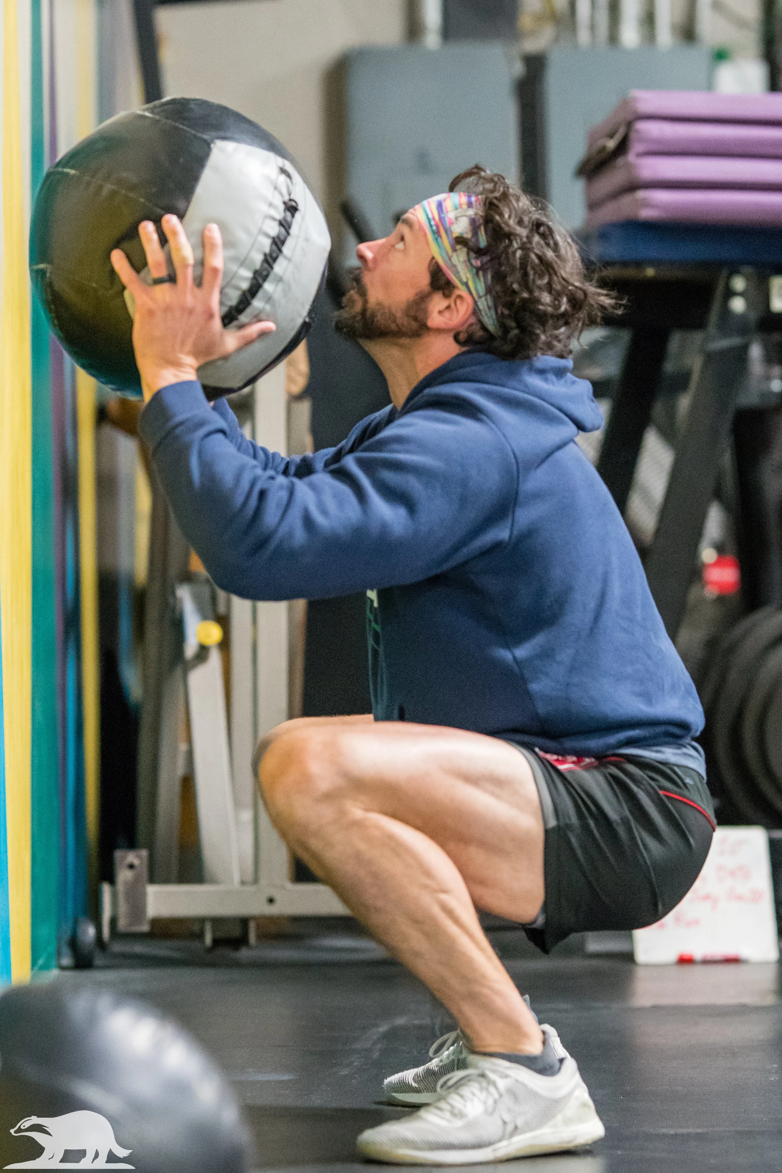 Wall Balls: Elbows should stay in front of the body and hip crease needs to pass below parallel. Focus on a good dynamic drive with tension out of the hole as we release the ball.