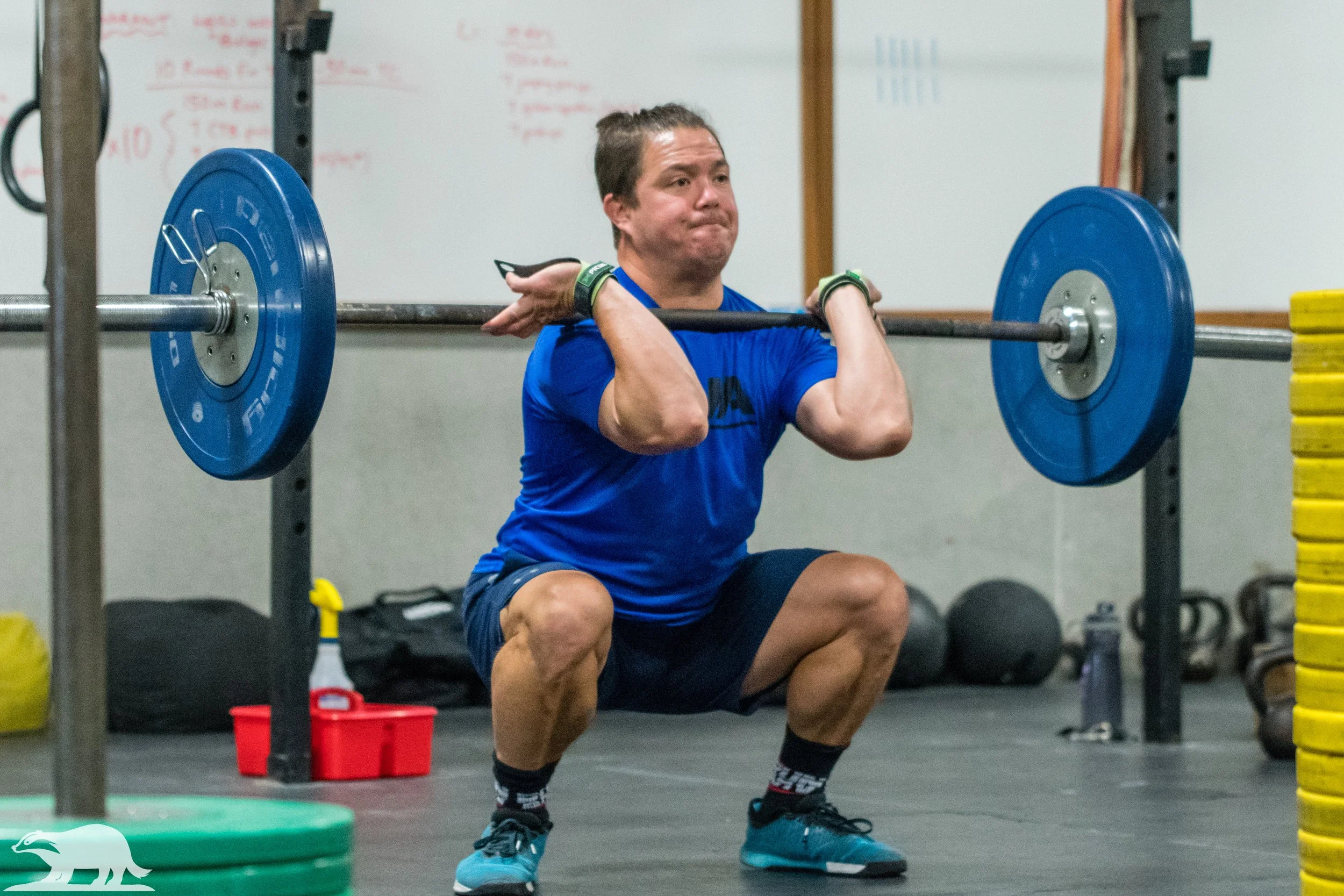 Wall Balls: Elbows should stay in front of the body and hip crease needs to pass below parallel. Focus on a good dynamic drive with tension out of the hole as we release the ball.