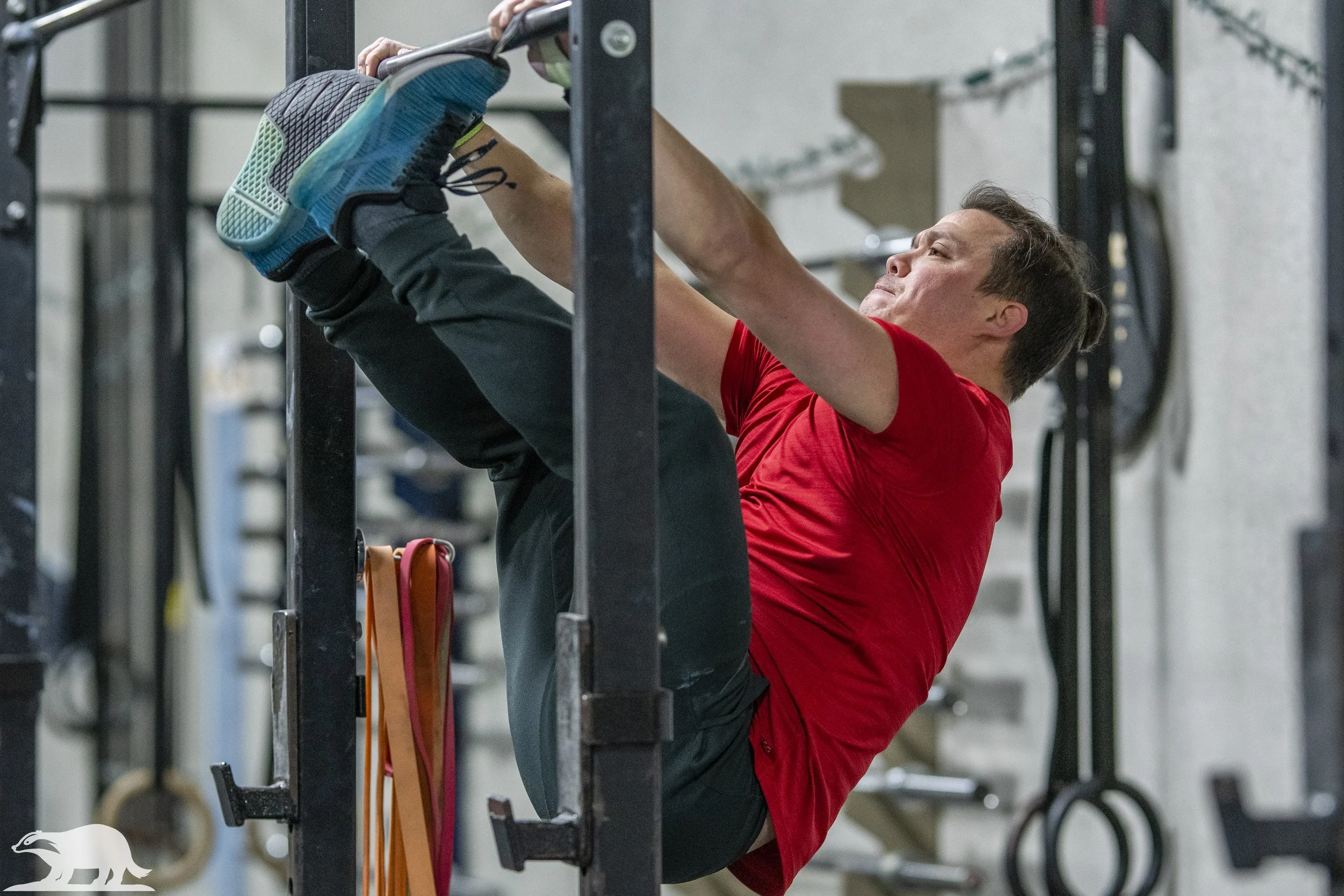 Toes-to-bars: We are focused on maintaining an active shoulder position as we move through the hollow position to the arched position. Focus to press away from the bar to create space that will allow for compression of the midline and the toes to come to the bar. We should look to keep the dynamic positions today when scaling, so moving to an alternating toes-to-bar or kipping knees-to-elbow/knee-to-chest would be ideal in order to maintain fluid dynamics. The next scale would be to move to a strict knee raise or knees-to-elbow, specifically for those with shoulder or back issues.
