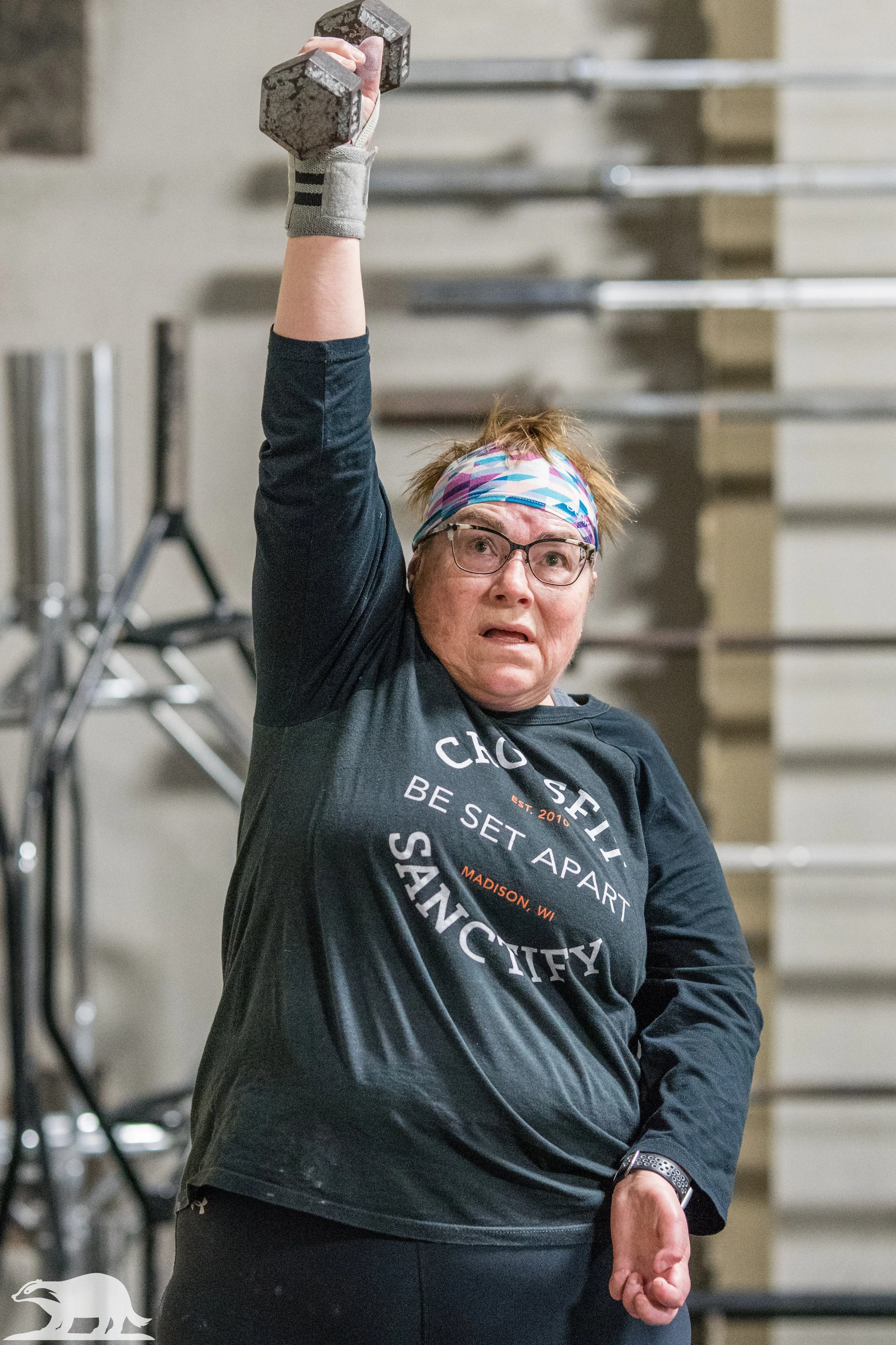-Single Arm Dumbbell Push Press: Work to keep the posterior delts and lats engaged at the front rack position on the dip and drive. This will help to keep the shoulder healthy as well as create a better position to press off of.