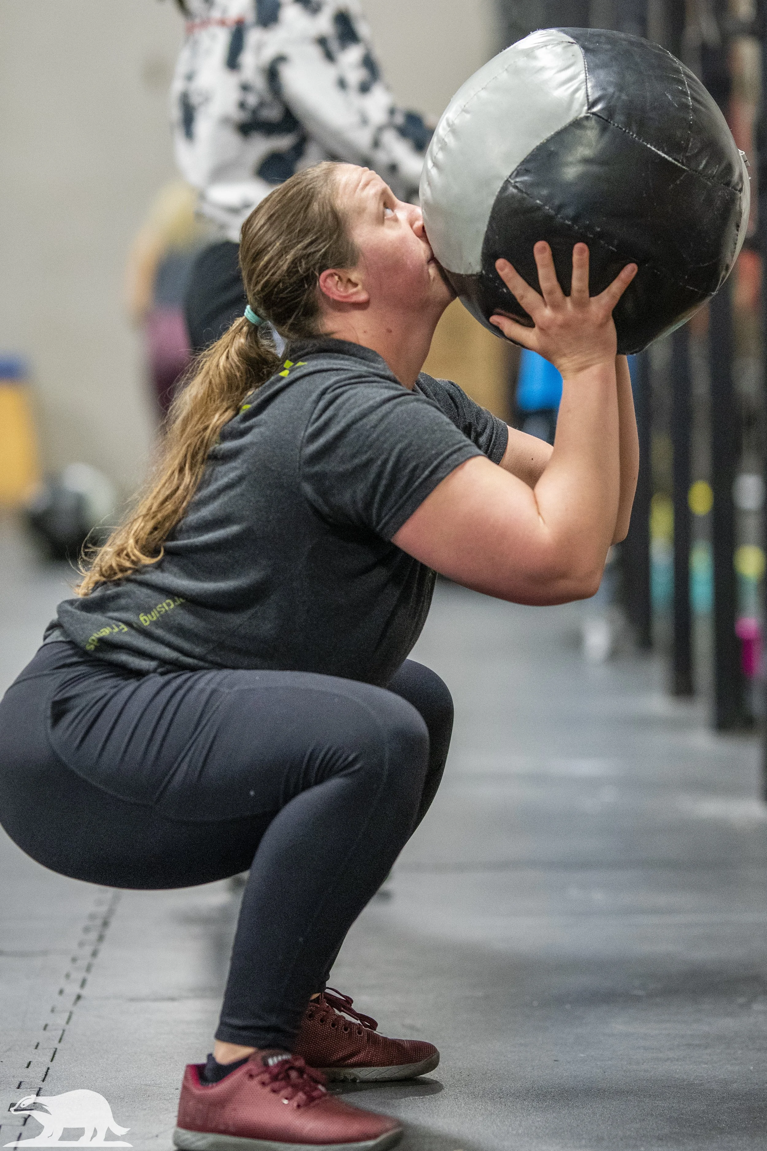 Wall Balls: Elbows should stay in front of the body and hip crease needs to pass below parallel. Focus on a good dynamic drive with tension out of the hole as we release the ball. Let's first move to reduce the weight, then secondly reduce the height of the target, and thirdly we can move to a light thrusters.